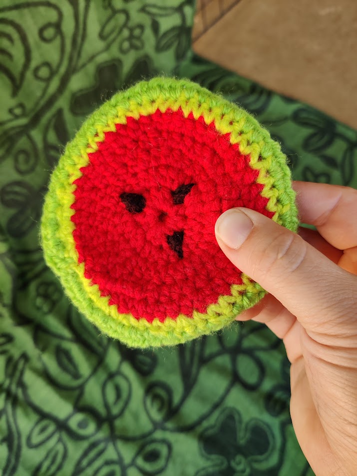 This Watermelon Slice Silent Crocheted Fidget, a delightful sensory toy designed to soothe restless hands and minds. Handcrafted with soft, durable yarn, this charming fidget is shaped like a circular slice of juicy watermelon, complete with vibrant green rind, a sweet red center, and tiny black seeds.